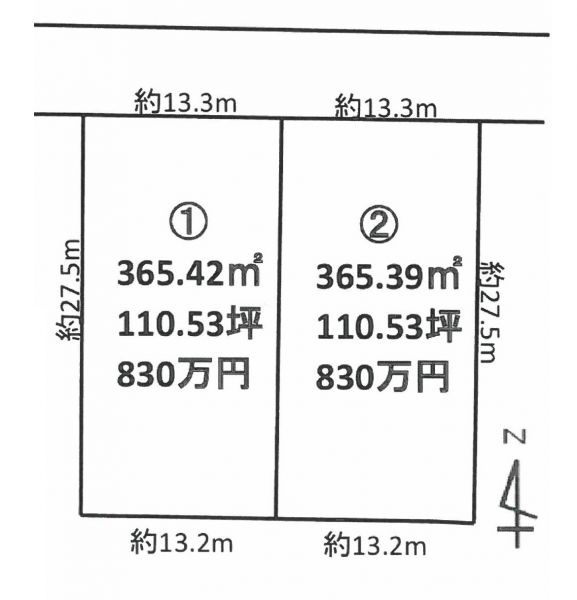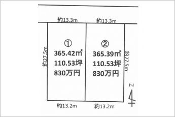 ①365.42㎡(110.53坪) 830万円 ②365.39㎡(110.53坪) 830万円 境東小学校まで約400m通学に安心!